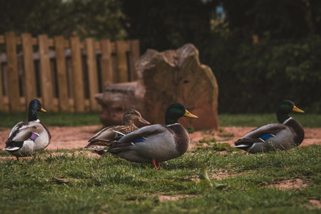 A beautiful shot of a cute mallard walking on a grass