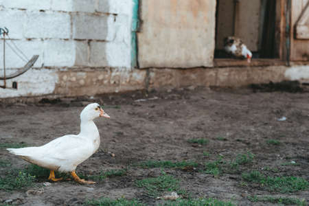 white duck walks on the farm