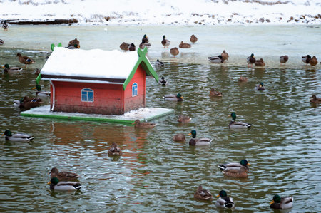 Ducks swim on the pond in winter. City pond in January.