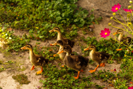 little ducklings in the village on the street walking