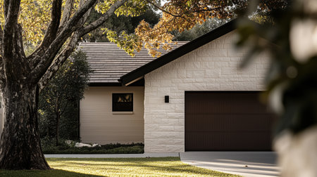 Minimalist house photo - architectural details, greenery, entry way, roof of suburb modern house, rich in textures, colors, nostalgy color scheme
