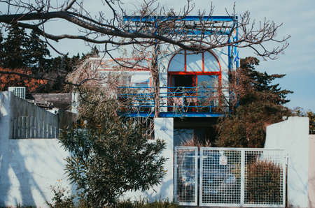 Colonia Del Sacramento, Uruguay - September 10, 2018: A medium sized house with colorful details and white walls surrounded with trees and tree branches.
