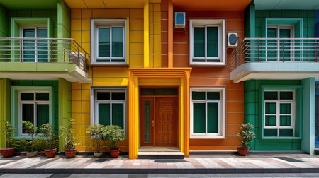 This image showcases a lively and modern apartment building featuring a vibrant color scheme, bright windows, and well-maintained greenery, creating an appealing urban scene.