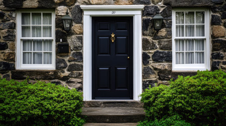 A charming traditional cottage entrance featuring a dark door and lush greenery. This inviting facade highlights vintage architecture and beautiful landscaping.