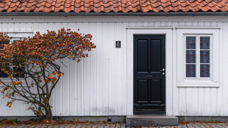 a black single front door against a backdrop of a white house, topped by a roof in striking red, grey, or black, embodying the timeless elegance and simplicity of Nordic design