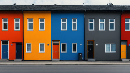 Brightly colored modern houses with vivid roofs stand against a clear blue sky, showcasing cheerful urban architecture.