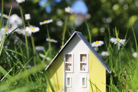 Model house in a lush meadow with daisies as a symbol of the desire for a home in the countryside