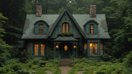 Discover an enchanting forest cottage featuring warm, inviting lights nestled among lush greenery, perfect for conveying magic and tranquility in nature.