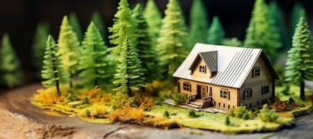 photo of miniature scene small model little house in deep wood forest , generative AI