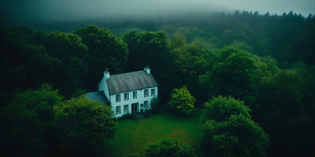 This stunning aerial photograph captures a serene house nestled amidst a vibrant forest, offering a peaceful escape into nature's beauty.