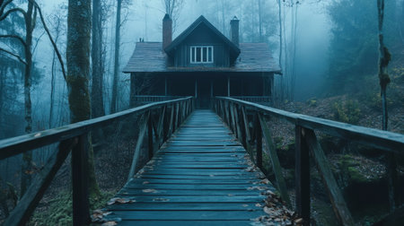 A wooden bridge leads to a shadowy house shrouded in fog, creating a scene filled with mystery and intrigue in the forest