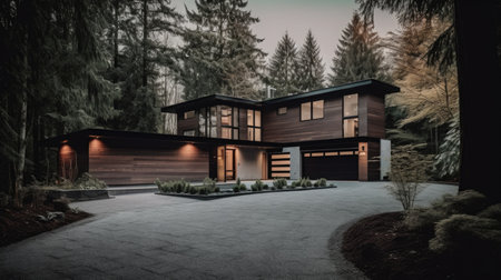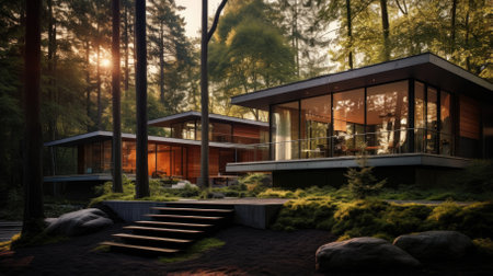 Home architecture design in Mid-century modern Style with Courtyard constructed by Wood and Glass material. Mid-century modern architecture style. Generative AI AIG25 .