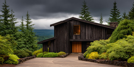 A striking wooden house stands surrounded by lush green trees, with dark clouds overhead creating a dramatic atmosphere. The quiet setting highlights the harmony between nature and architecture.