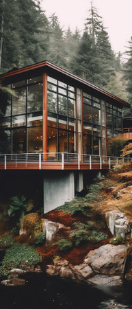 A stunning modern glass house nestled in a vibrant forest, showcasing contemporary design and serene surroundings, ideal for relaxation and nature escape.