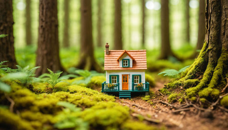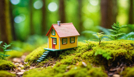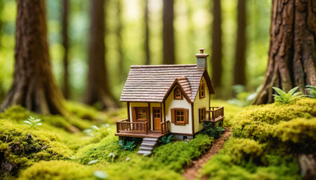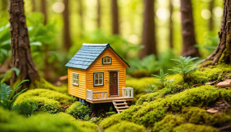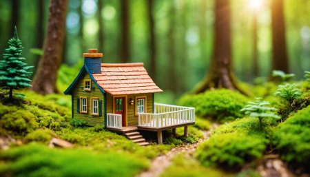 Miniature wooden house nestled in vibrant green moss, surrounded by serene forest atmosphere, evokes sense of tranquility and connection to nature