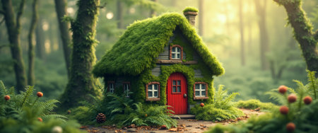 Nestled in a lush, green forest, this charming cottage is adorned with a vibrant mossy roof and a bright red door, inviting all who wander by. Surrounded by ferns and delicate mushrooms, the scene radiates a magical, fairy-tale atmosphere, evoking feelings of wonder and tranquility.