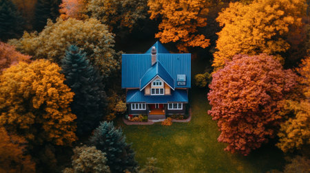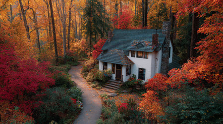 A charming house nestled among vibrant autumn trees, showcasing a colorful array of seasonal foliage in a peaceful outdoor setting. A perfect retreat.