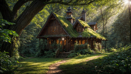 Cozy cabin in a lush green forest with a moss-covered roof, tranquil and serene atmosphere