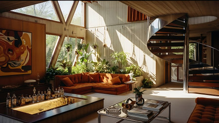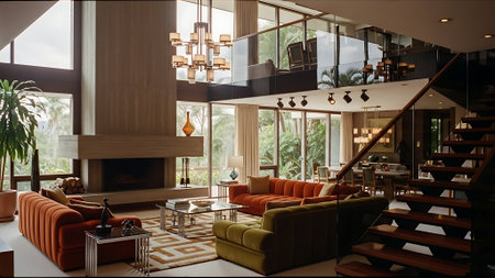 A stylish mid-century modern living room with large windows, featuring orange and green sofas, a grand piano, and decorative plants