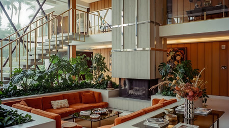 A cozy and stylish living room featuring two vibrant sofas in orange and green, a glass coffee table, large indoor plants, and a modern fireplace, with warm sunlight streaming in through large windows