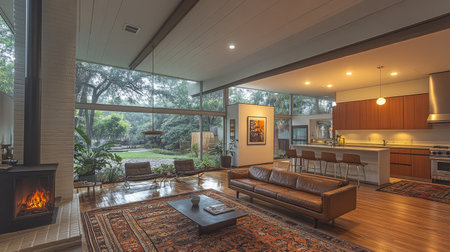 A mid-century modern-style living room with a fireplace, oak wood floors and ceiling beams, a leather sofa, dark brown accent chairs, a large area rug, and natural light from the windows. This is a professional photograph. --chaos 30 --ar 16:9 --stylize 750 --v 6.1 Job ID: 8530ab51-ff35-40da-a372-5842804c9dc7