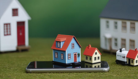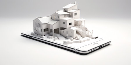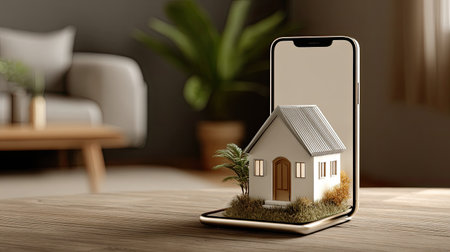 A detailed miniature house with trees and landscaping sits on a smartphone, symbolizing innovative real estate trends and mobile technology.