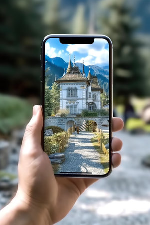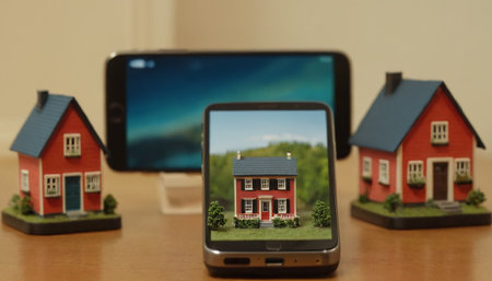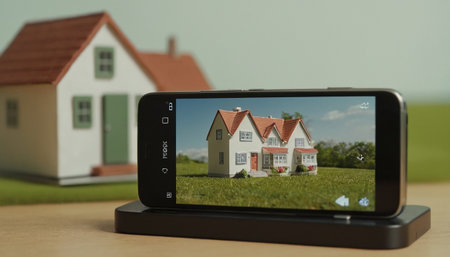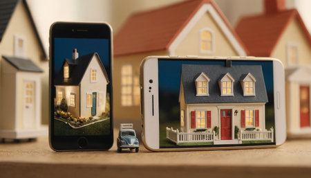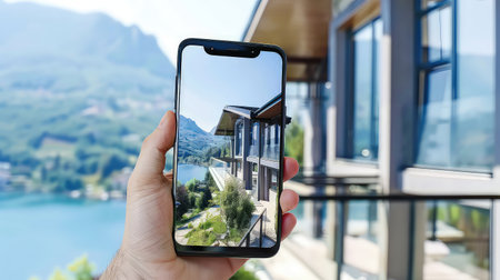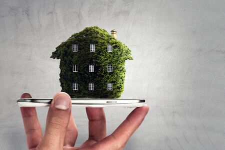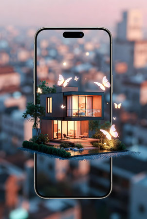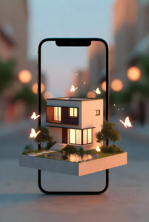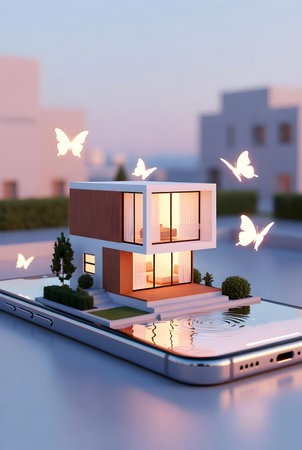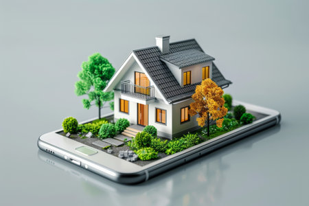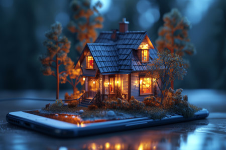 A captivating image showcasing a miniature house placed on a smartphone, surrounded by lush greenery, symbolizing the blend of technology and home design.