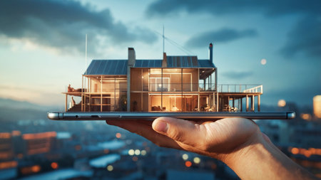 A stylish modern house appears to float on the palm of a hand, symbolizing the union of architecture and technology. The warm glow from the windows highlights the home inviting atmosphere.