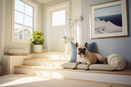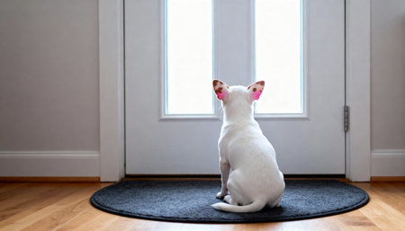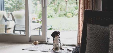 Dog sits on a floor by the window and waiting owners return in a contemporary living space.