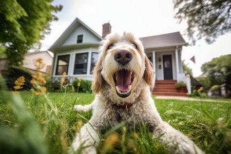 Cute dog lying on the grass in front of a beautiful house