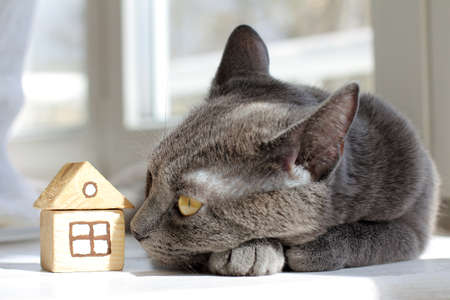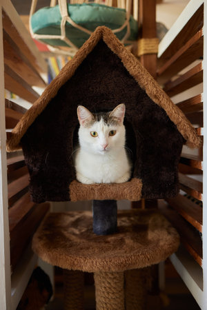 cat resting comfortably at home with a toy house
