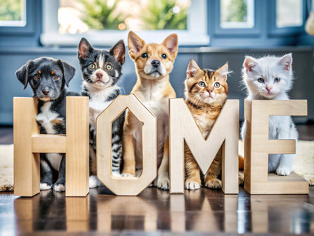Group of cats and dogs at home. The word home is made of wooden letters.