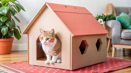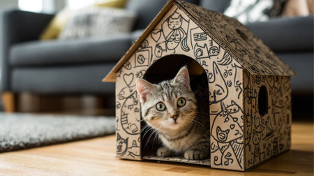 A charming cat peeks out from a creatively designed cardboard house, showcasing its playful spirit in a stylish indoor living space filled with warmth.