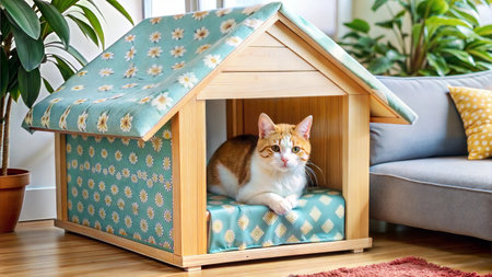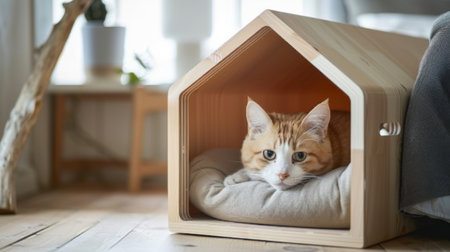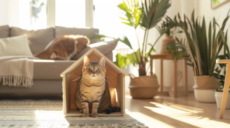 A serene cat sitting inside a beautifully designed wooden cat house placed in a bright, Scandinavian-style living room