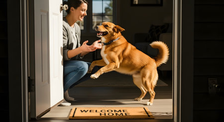 An excited brown dog with its tail wagging jumps up to greet a smiling woman at the front door. The woman is crouching down with her arms open. A 'WELCOME HOME' doormat is on the floor, symbolizing a happy reunion.