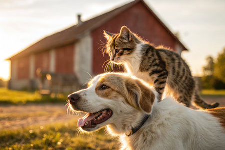 A heartwarming scene of a dog carrying a kitten on its back outdoors at sunset near a barn.