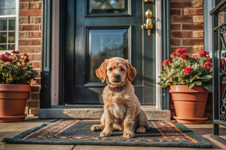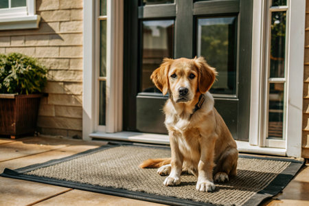 golden retriever at home entrance looks inwards