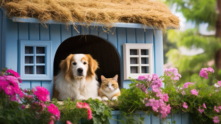 thatched dog and cat house illustration garden blue, porch fluffy, lounging playful thatched dog and cat house