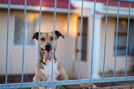 Dog staring through gate with tongue out