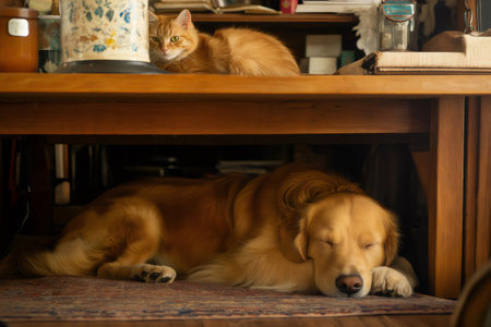 Golden retriever dog sleeping peacefully under a wooden table, while an orange tabby cat watches from the tabletop