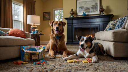 An AI generated illustration of two dogs resting side by side on the floor, surrounded by playthings