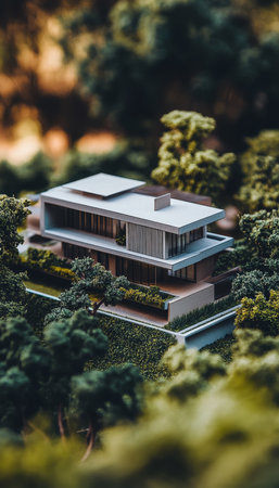Intricate architectural model of a contemporary house surrounded by lush greenery