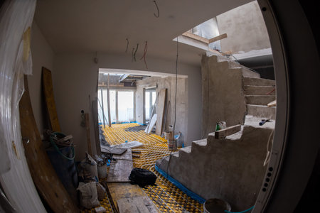 yellow underfloor heating installation with white polyethylene pipes on construction site of new two level apartment