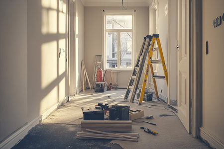 Prepare modern living space during home renovation featuring tools unfinished walls during works day