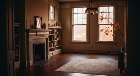 A cozy modern living room featuring a fireplace, large windows with autumn views, stylish furniture, and decorative plants