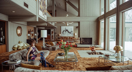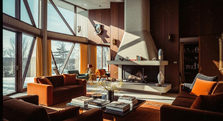 A cozy mid-century modern living room with a stone fireplace, large windows showing a snowy landscape, and stylish furniture including a patterned sofa and coffee table
