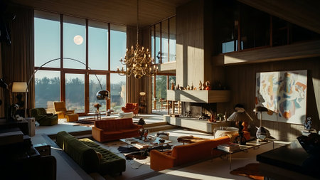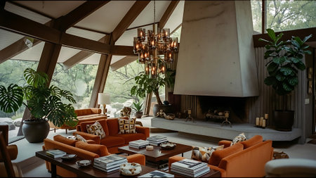 A cozy living room with mid-century modern decor, featuring orange sofas, a stone fireplace, and colorful abstract art on the walls
