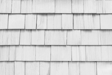 A close up shot of a detailed wooden shingle roof, showing the texture and patterns of the weathered wood.