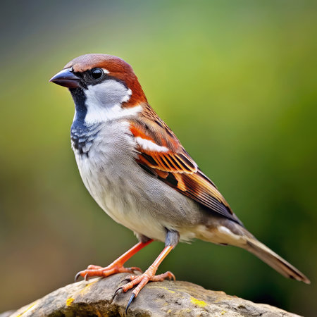 A beautiful sparrow sits gracefully on a moss-covered branch, showcasing its vibrant plumage against a soft green background, highlighting nature
