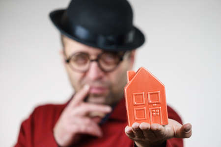 Adult man wearing funny hat and eyeglasses holding small red house model. Guy thinking of becoming real estate agent. Home ownership concept.